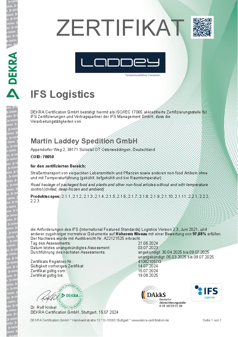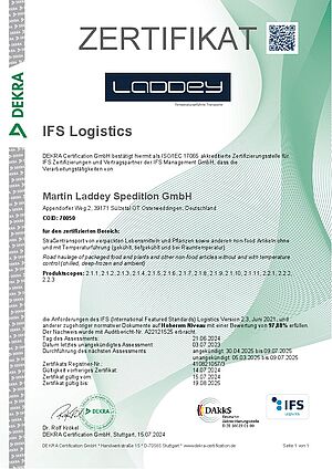 Die Martin Laddey Spedition ist zertifiziert nach IFS Logistics 2.3. Von Frische bis Tiefkühlware – wir bringen Ihre guten Produkte und Waren sicher zu Ihren Kunden.